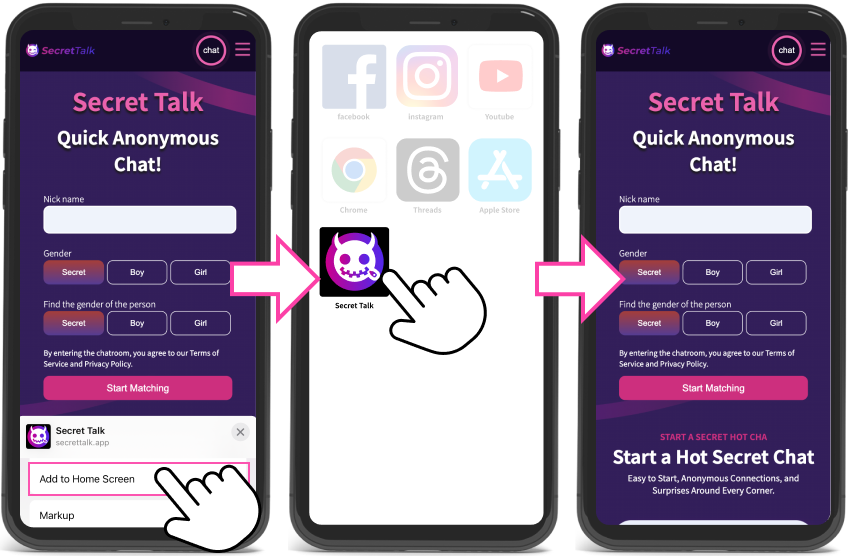 只需幾個簡單的步驟,選擇性別和興趣,即刻匹配,開啟即時熱聊。